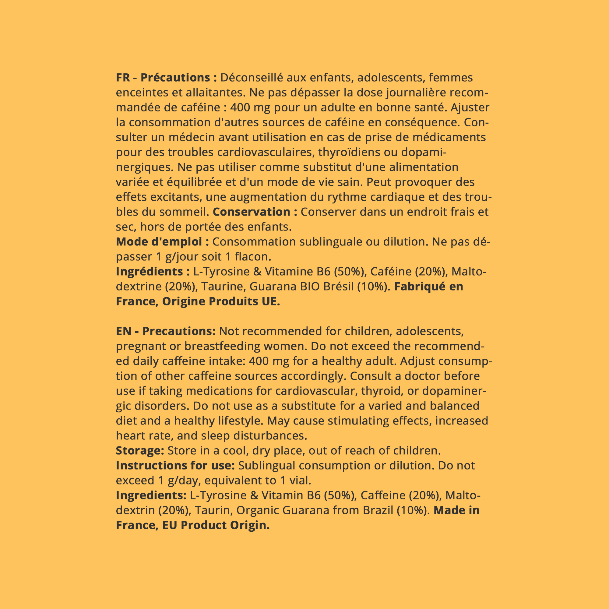 L-Tyrosine & Vitamine B6 (50%), Taurine (20%), Caféine (20%), Maltodextrine (20%), Guarana BIO Brésil (10%).