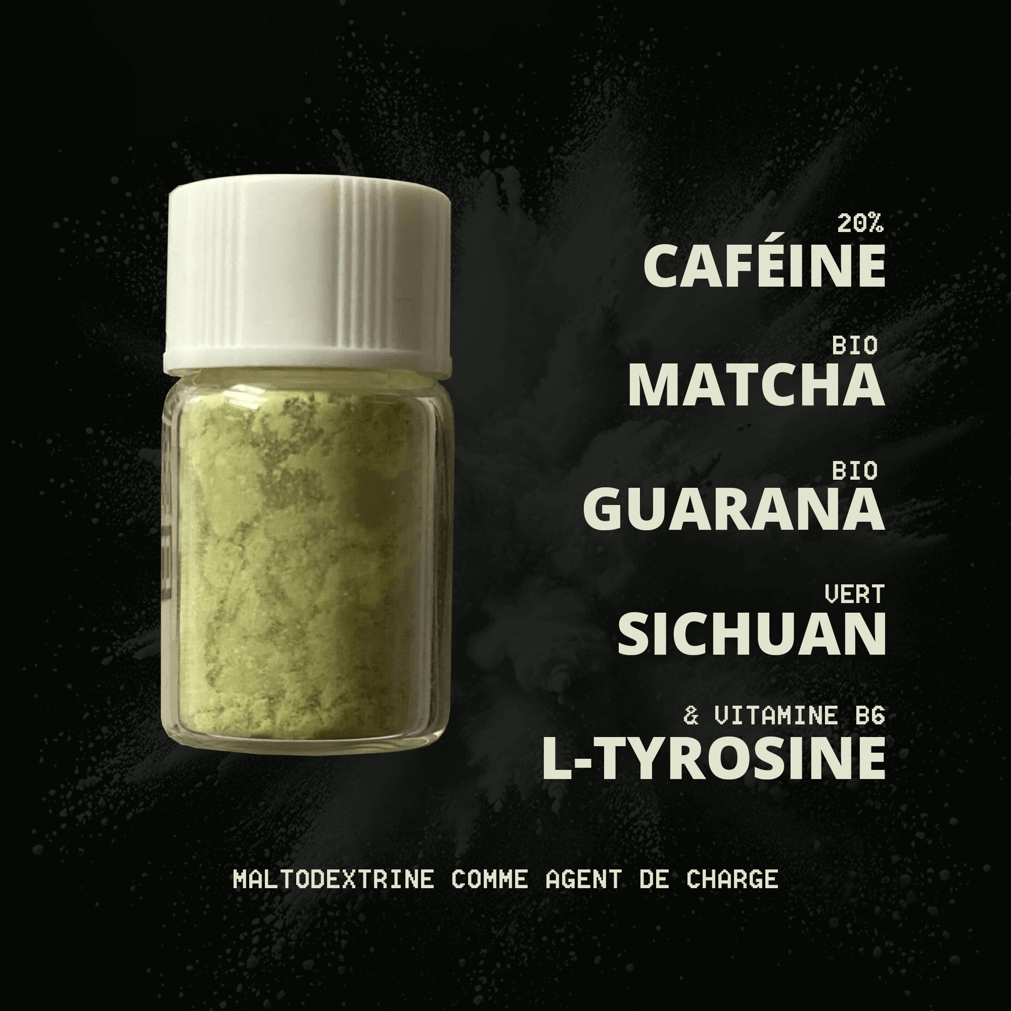 Maltodextrine (30%), Extraits de plantes (35%) [incluant Matcha Bio, Guarana Bio (Brésil), Sichuan Vert], Caféine (20%), Complexe d’acides aminés et vitamines (15%) [incluant L-Tyrosine et Vitamine B6]. Peut contenir des traces de gingembre.